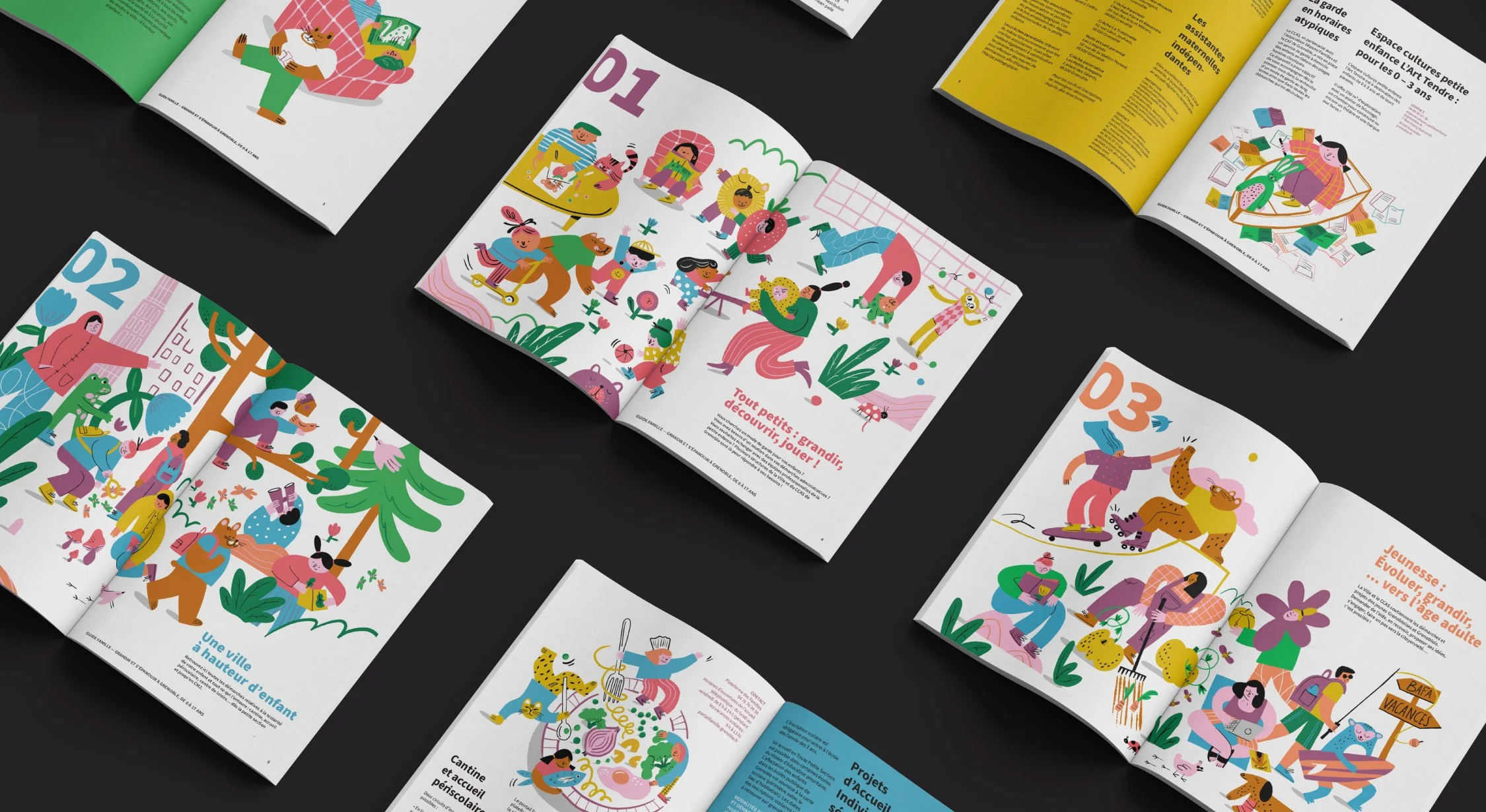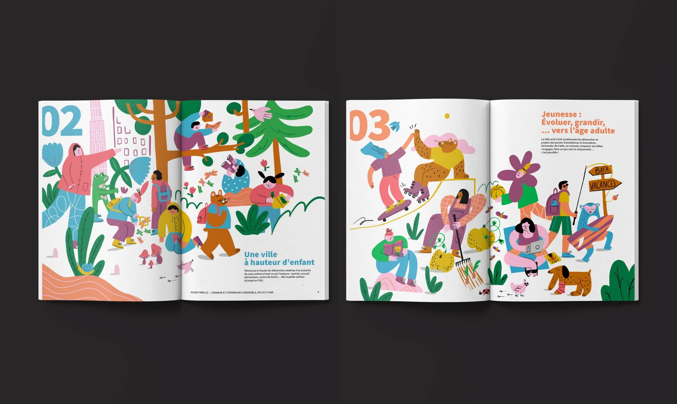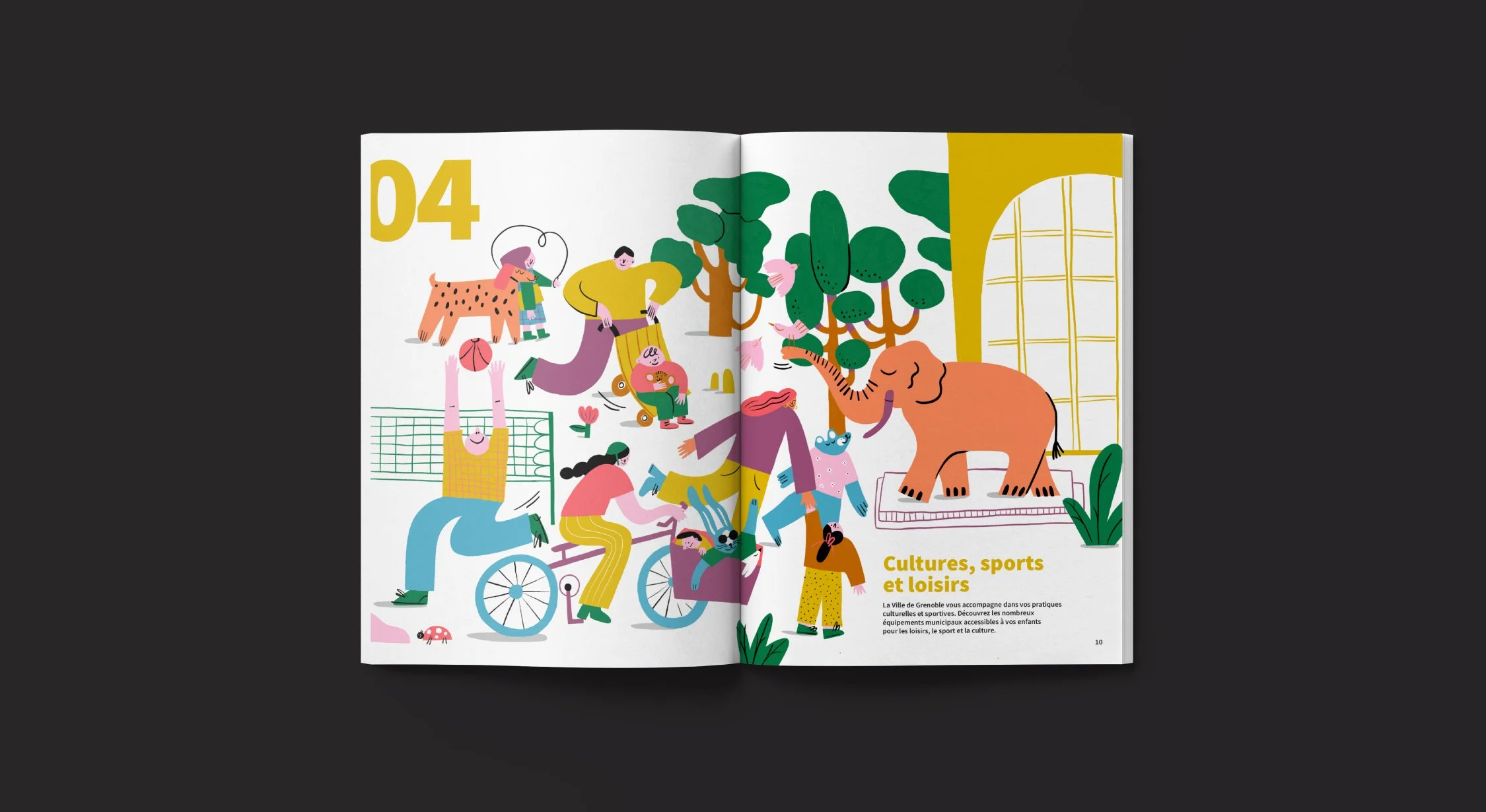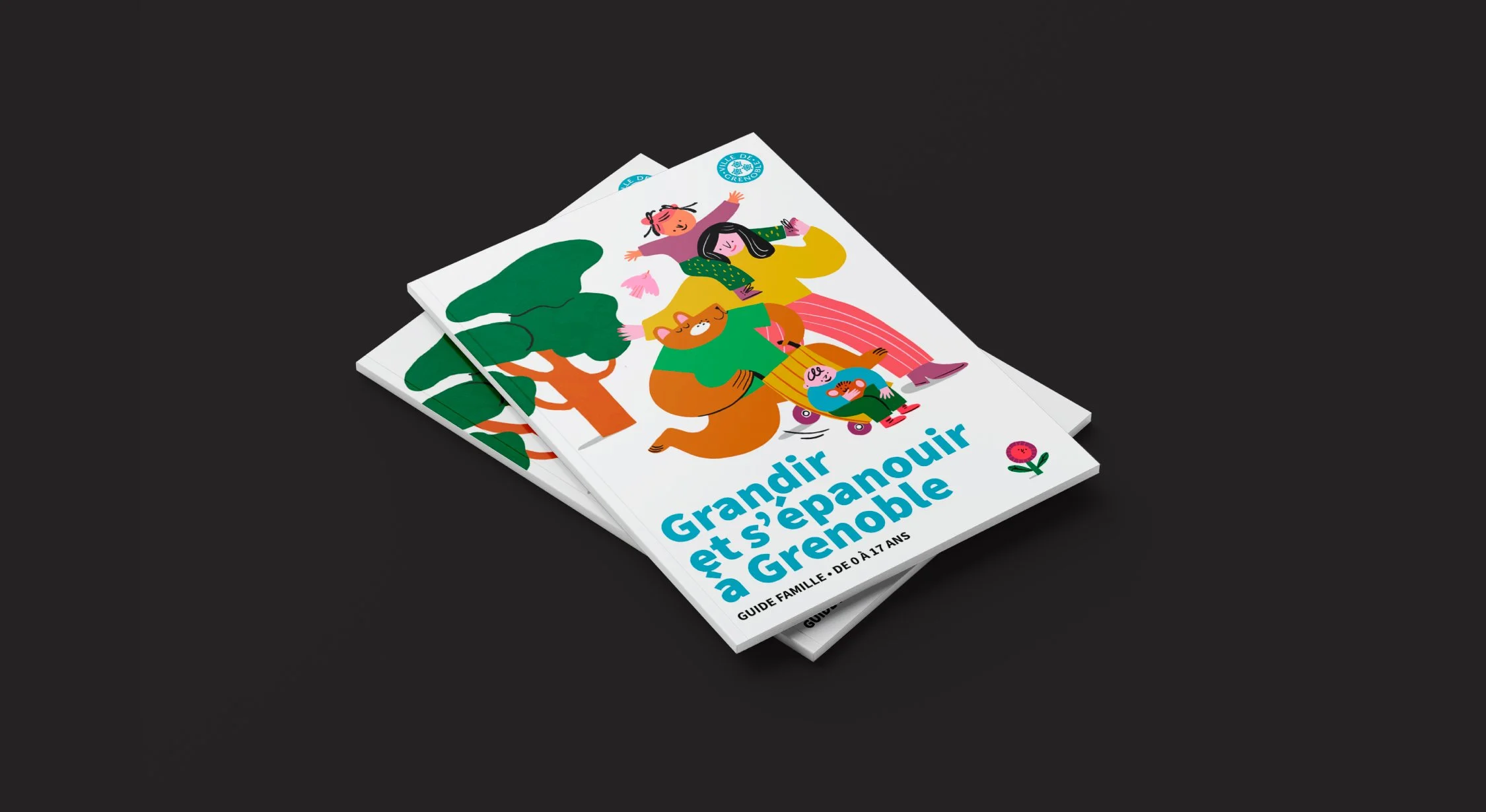 Cette brochure illustrée a été réalisée pour accompagner les familles qui s’installent à Grenoble dans leurs premiers pas dans la ville. Elle rassemble des informations pratiques sur la vie quotidienne — écoles, services, activités, transports — tout en proposant un regard illustré qui rend la découverte plus ludique et accessible.
